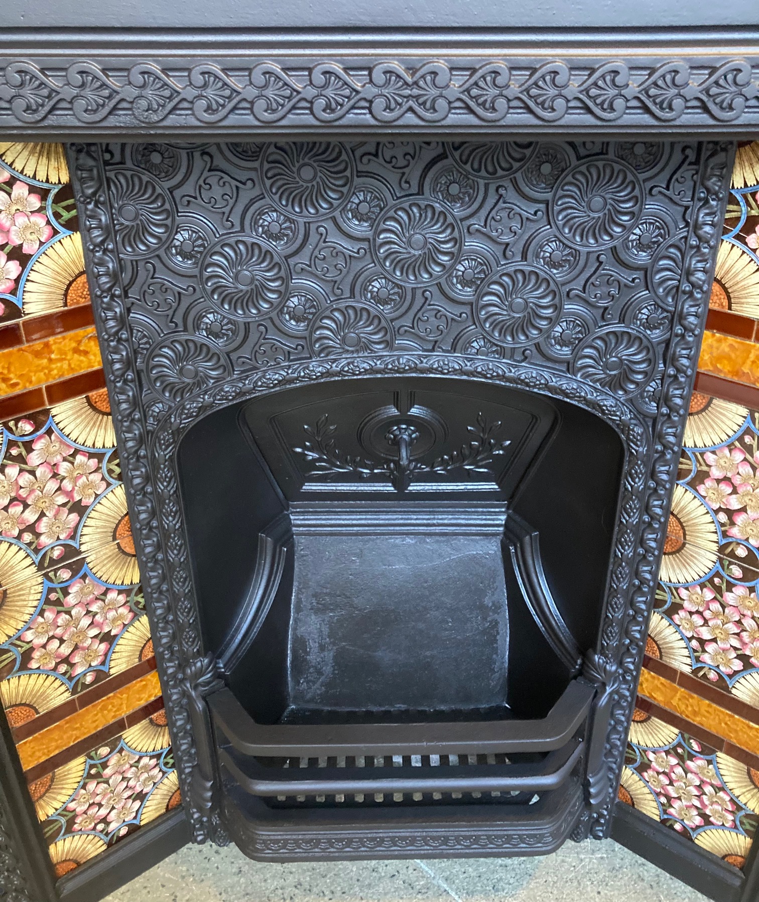 SOLD Detail of Ornate, rare English-made Victorian cast iron fireplace insert, ex-Melbourne mansion, registered design in 1884, fully restored with original hand tinted feature tiles with blossoms included. 1020 x 1020mm (F44) $1550
