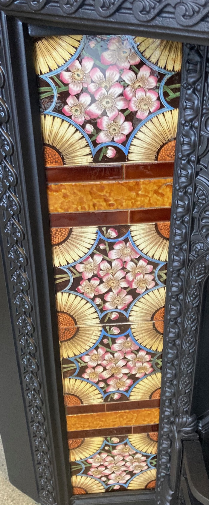 SOLD Detail of Ornate, rare English-made Victorian cast iron fireplace insert, ex-Melbourne mansion, registered design in 1884, fully restored with original hand tinted feature tiles with blossoms included. 1020 x 1020mm (F44) $1550