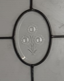 Detail of Clear glass leadlight window panels, bevel oval with trio of cut glass flowers, 4 panels available 490mm h x 340mm w, $345 each