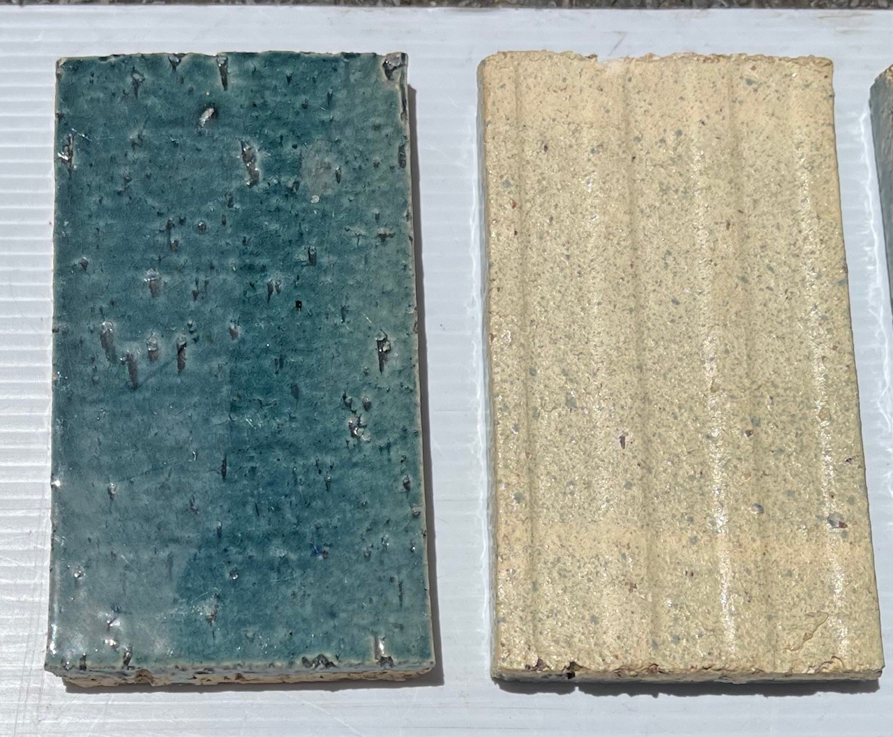 Detail of the rare find of small glazed warm blue tiles, likely maker is Malkin Edge & Co. England. Originally from Arts and Crafts furniture use in the early 1900s in excellent condition. Can be used on a hearth. (SET634UP) Set of 39 available. $420.