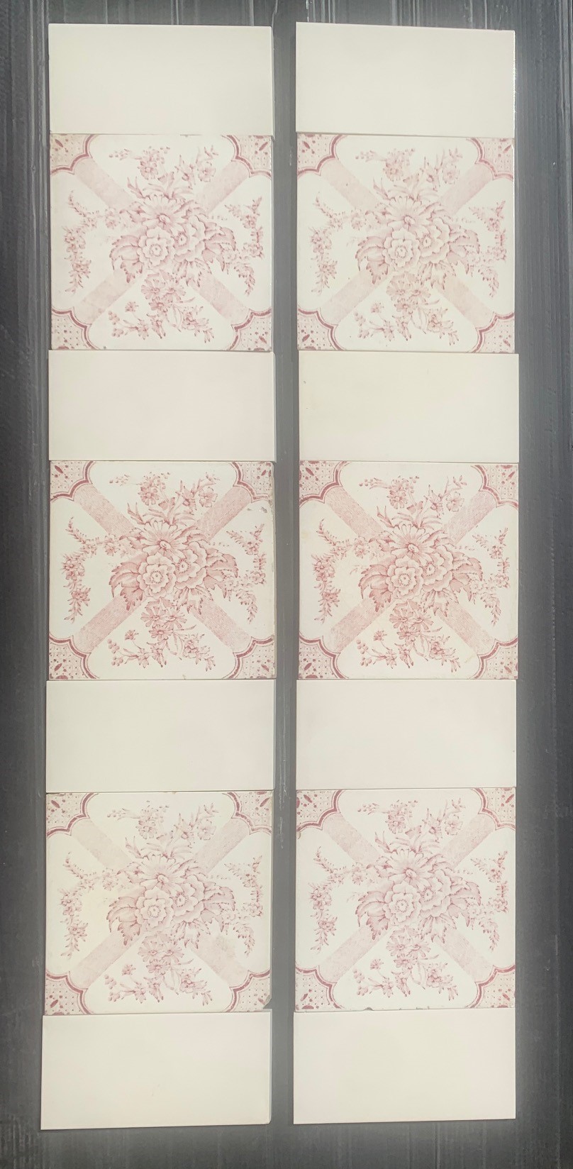 SOLD Original T and R Boote, England, c1900 floral print feature tiles, pale burgundy with off white glaze. Two panel set with 6 feature tiles (SET474) $250