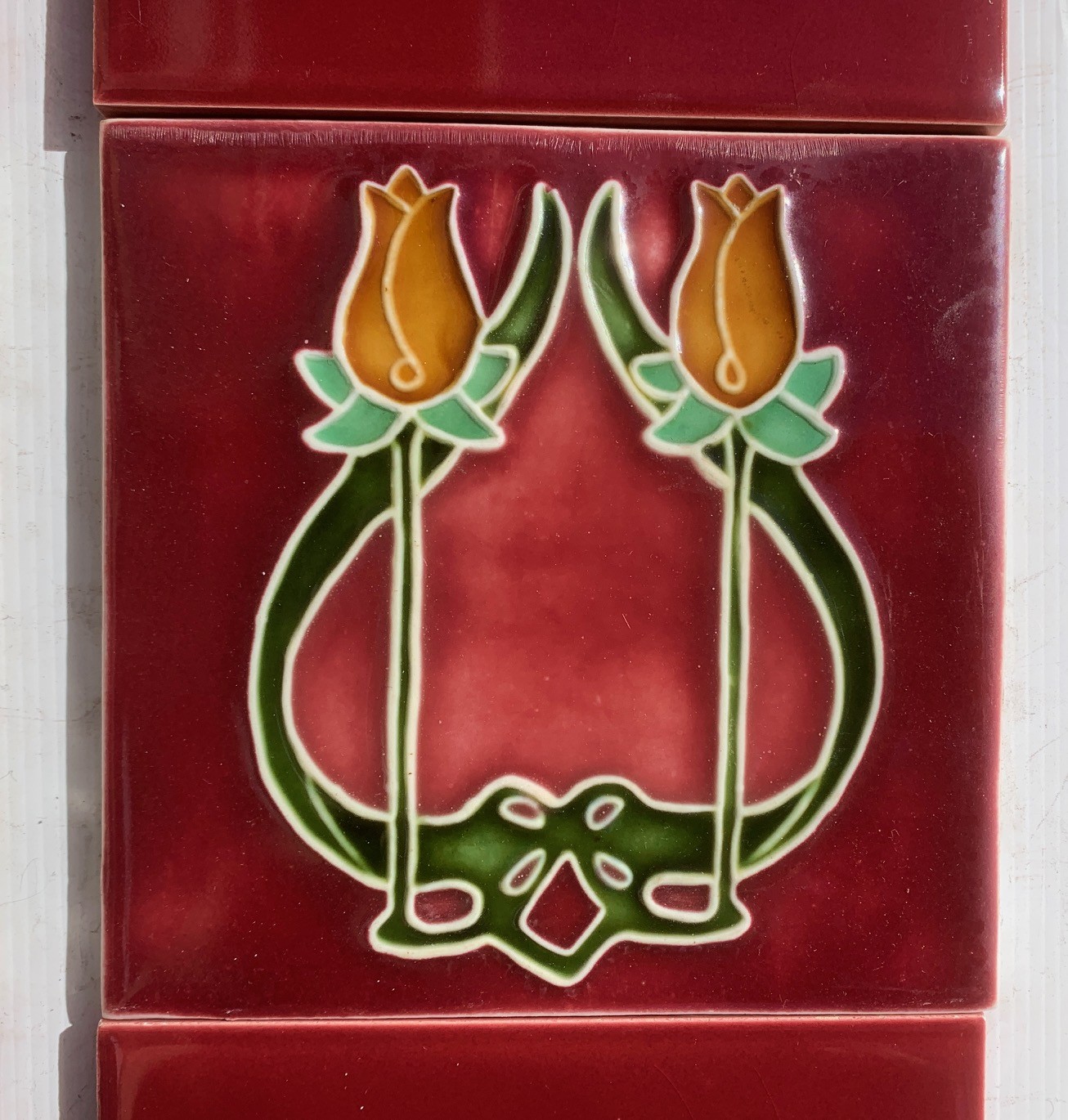 SOLD Detail of Porteous NZ feature tiles, Art Nouveau style amber colour tulip flowers on rich burgundy background. (OTB344), Two panel fireplace tile set is $180