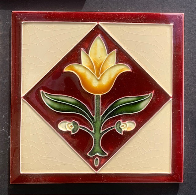 SOLD Detail of Johnson reproduction moulded feature tiles, yellow tulip with green foliage on burgundy and beige background. 153 x 153 x 8mm, 3 available (SET470) $35 each