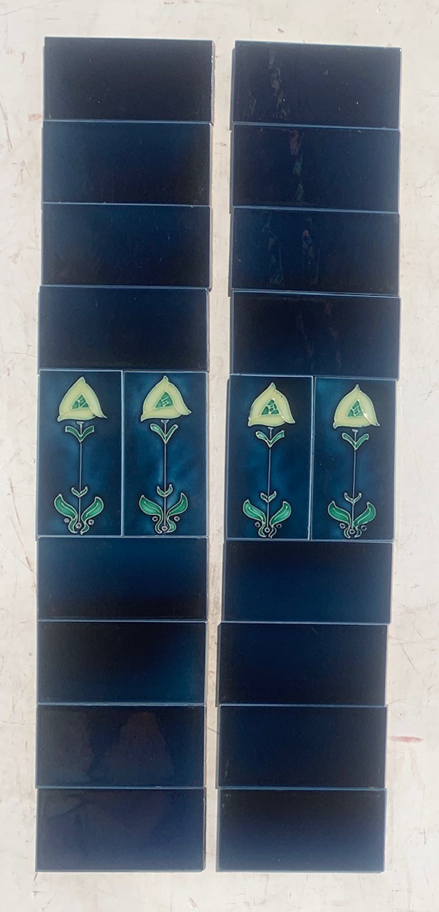 Original hand-tubelined T&R Boote, England 3 x 6 inch feature tiles. Circa 1910, single Art Nouveau stylised flower, deep blue, lemon and emerald glazes. Original plain blue tiles. (SET481) 2 panel set for $390