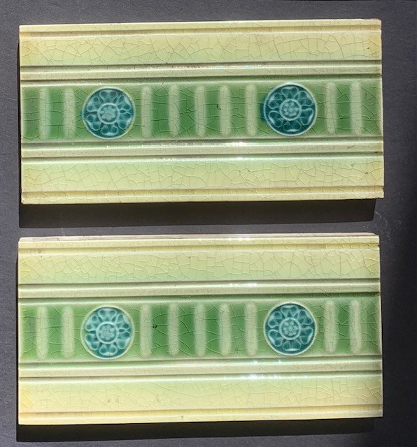 SOLD Pilkington Tile Co. England. moulded feature tiles. classical design pale yellow, olive green and sea blue glazes. 152 x 77 x 10mm, 6 available $38 /pair (SET 509)