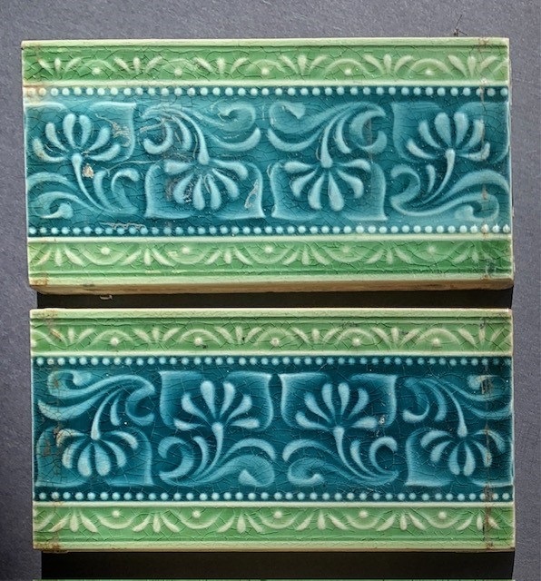 SOLD please see website for more options Published 6 October 2023 at 596 × 640 in Tiles Pilkingtons Tile and Pottery Co. England. c1905, moulded floral design in sea blue and fern green, 156 x 79 x 10mm. Set of 6 tiles, $120 (SET 390) Pilkingtons Tile and Pottery Co. England. c1905, moulded floral design in sea blue and fern green, 156 x 79 x 10mm. Set of 6 tiles, $120 (SET 390)