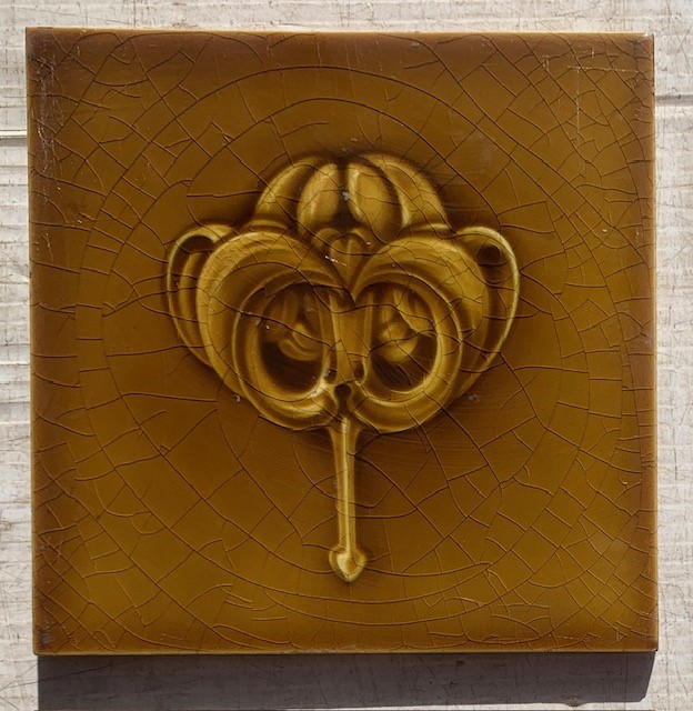 Detail of Circa 1900 Art Nouveau majolica feature tiles. Stylised flower design, press moulded. Deep honey coloured glaze. (SET495) Pair for $90