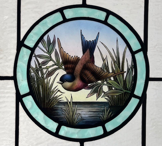 Hand painted detail of second stunning sash window with original hand painted leadlight bird, blue, green and red colouring, no breaks in glass, frame is H 885 x W 895mm, glass is H 800 x W 795mm, matches window LL336, (LL337) $765