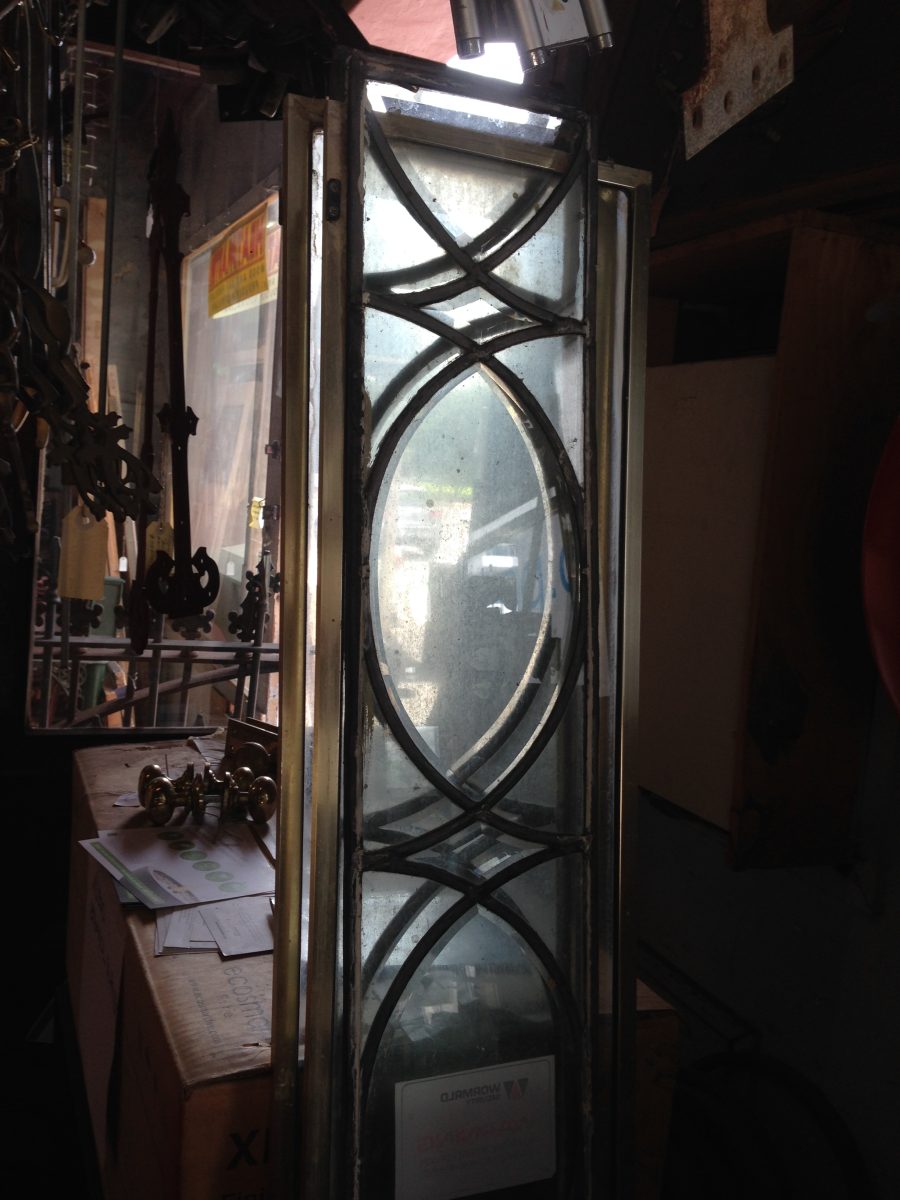 Tall leadlight sidelight window panels, pattern of intersecting arcs, bevel cut clear glass 1850mm x 195mm, 2 available, $250 each