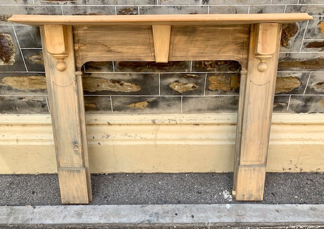 Stripped timber mantel. original, half turnings and keystone in breastplate, Top shelf width 1435 x Height 1115mm. openign W 920 x H 895mm. (M65) $330