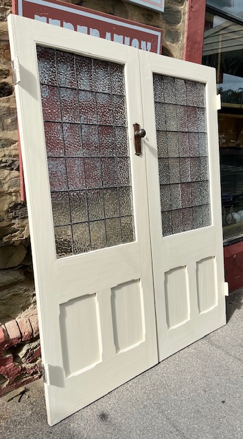 Leadlight textured glass internal French doors, painted cream, 30 panels of textured glass in each door, excellent condition, H 1990 x W 1610 x D 38mm (D679) $660