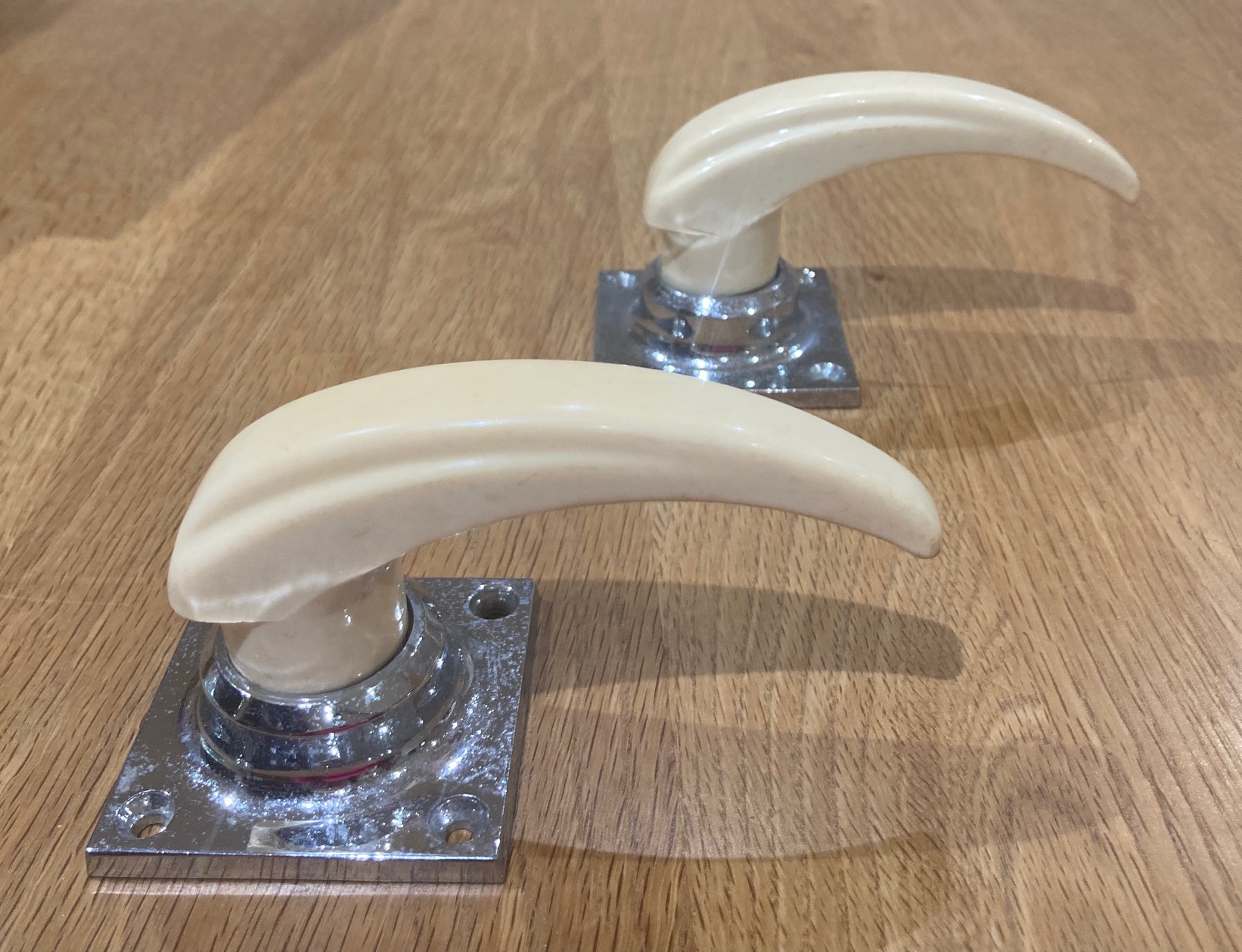 SOLD please see website for more options Published 1 September 2023 at 1642 × 1258 in SOLD please see website for more options SOLD Original chrome and cream bakelite handles, handle 10cm long, plate 6cm square, (H65) $45 pair SOLD Original chrome and cream bakelite handles, handle 10cm long, plate 6cm square, (H65) $45 pair