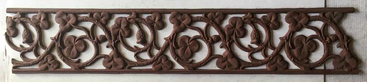 IMG_0508 Published 4 April 2018 at 1168 × 262 in IMG_0508 Original cast iron verandah lacework with clover/shamrock and scroll design. approx 6 metres available. height 160mm. $120 per metre Original cast iron verandah lacework with clover/shamrock and scroll design. approx 6 metres available. height 160mm. $120 per metre