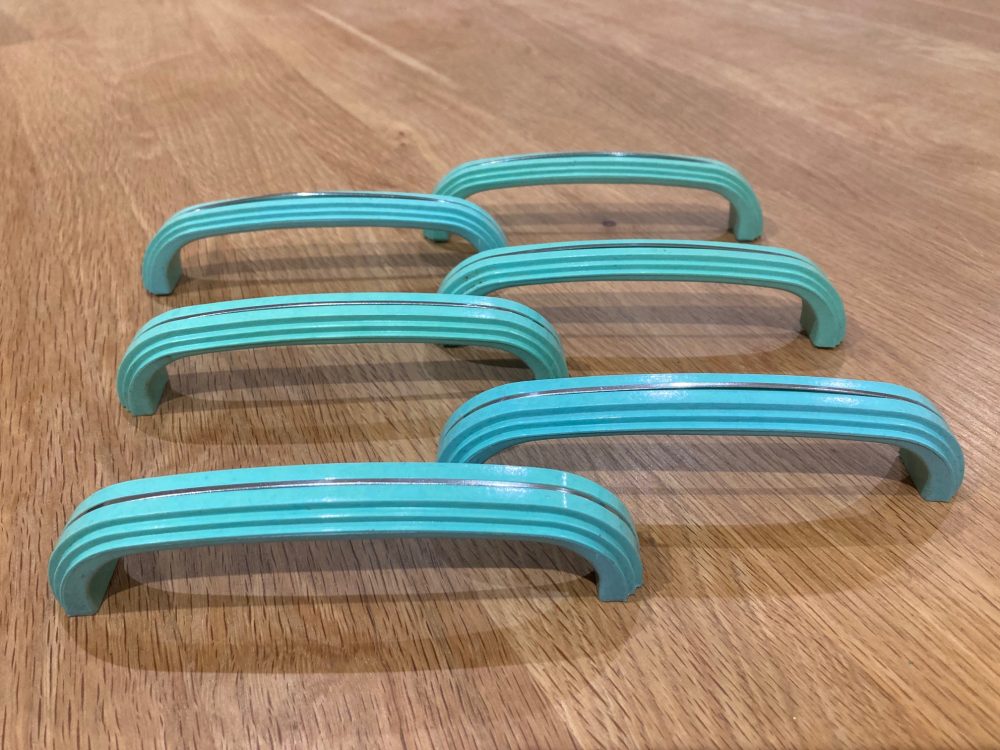 Original aqua and silver self striped handles, 13.5cm long, 12 available (6 with threaded rod) (H63) $18 each