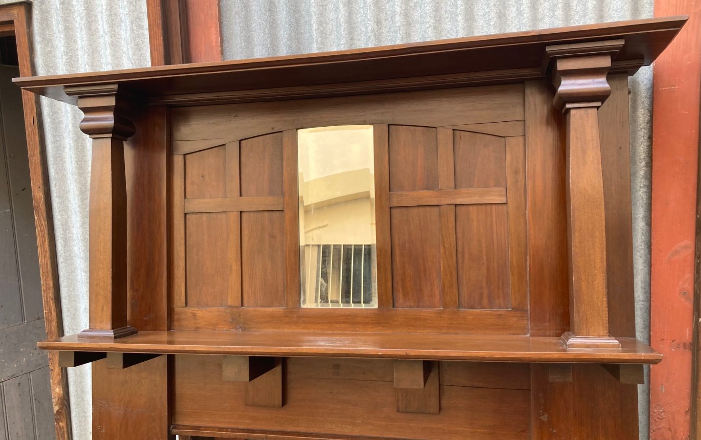 Detail of bungalow mantel in original polished blackwood with pillars between shelves and bevelled mirror, top shelf 1520 W x 240 D, height 1850, outer leg 1370 W, opening 915 W x 910 H (M169) $675