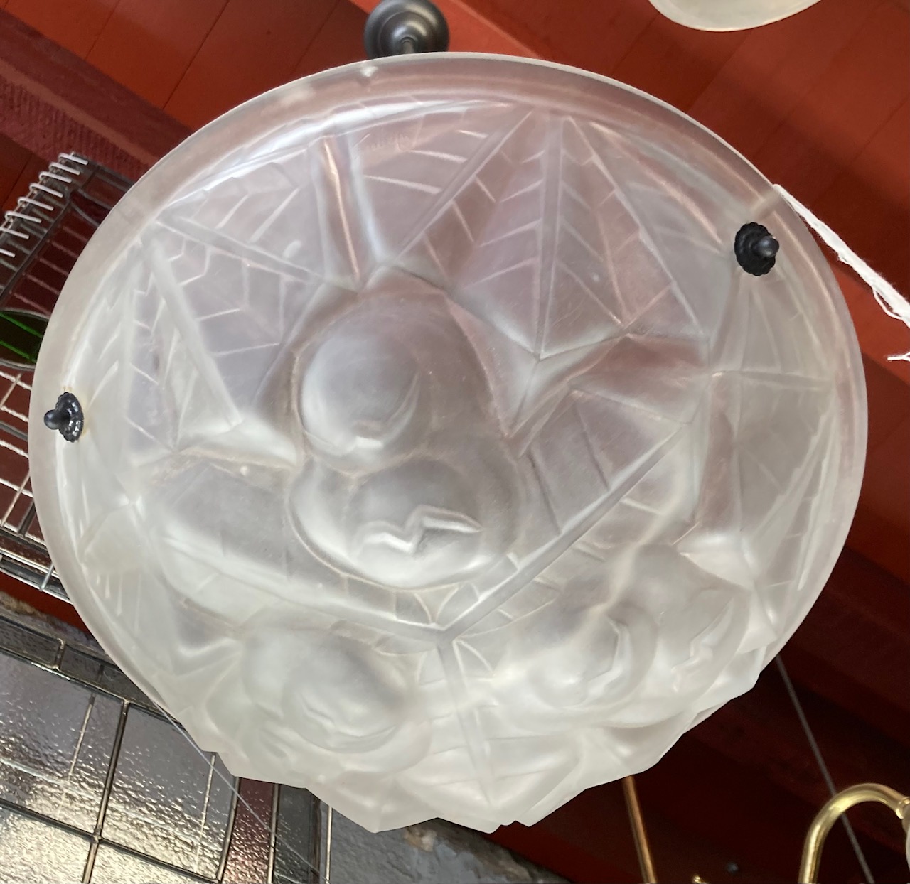 Shade detail of original Degue 1930s Art Deco heavy moulded glass bowl teamed up with new Florentine Bronze suspension rod kit and electrics. From Verrerie d’Art Degue glassworks in Paris by David Gueron. (L243) $675