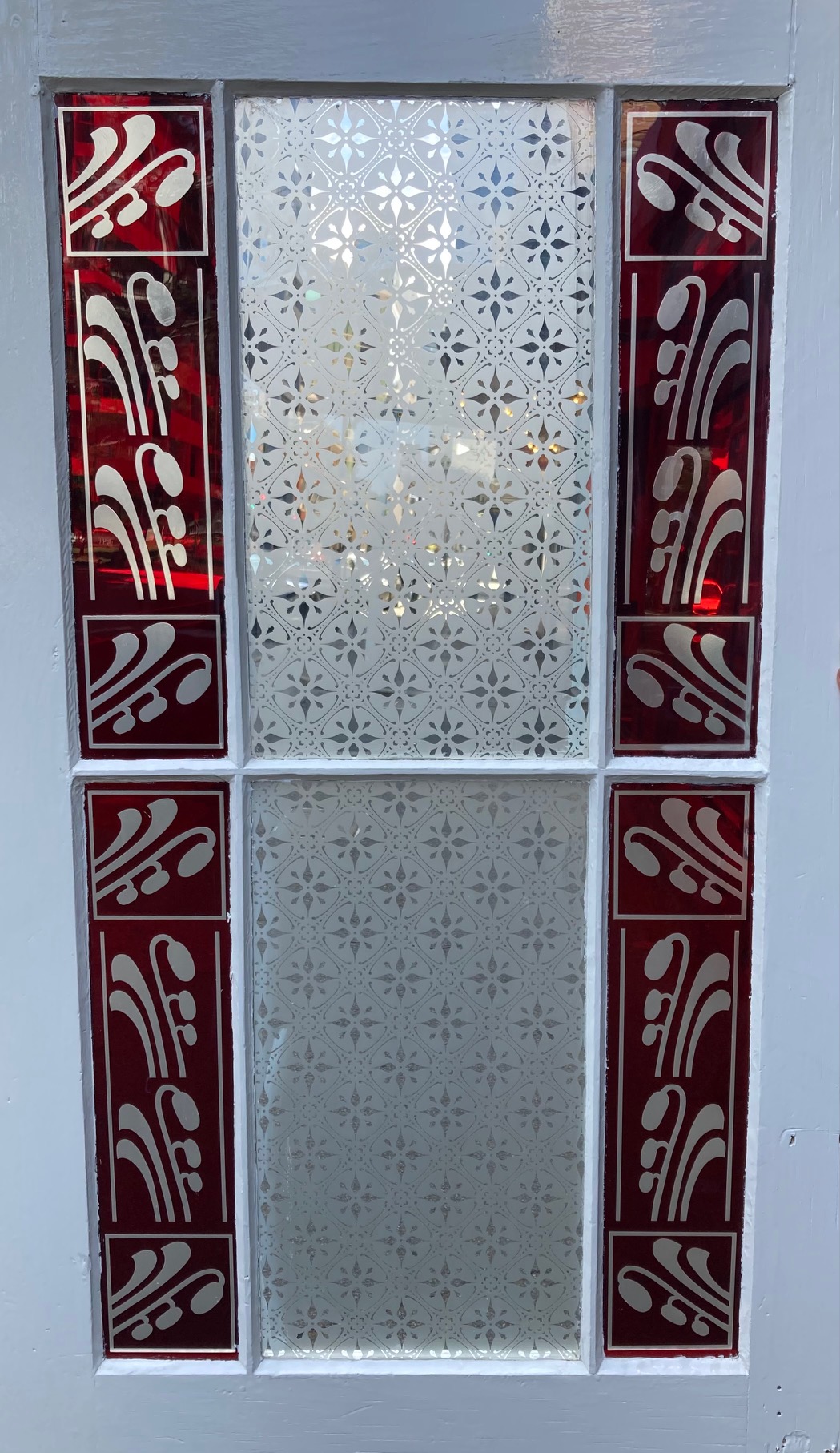 Etched glass detail of original Original astragal / end of passage door, painted white with the most beautiful etched glass, 750 wide x 1945 high x 40 deep (D93) $585