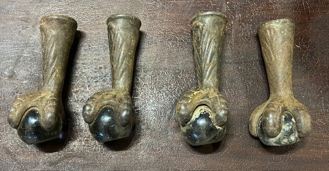 Victorian brass claw design piano stool feet with flat glass bases, H 9cm, 2cm opening, set of 4 (H711) $180