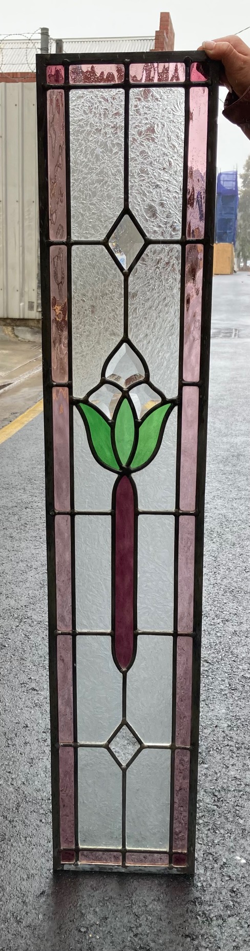 SOLD Original restored lead light panel, pink, maroon, green, 1120mm H x 210mm W (LL44) $185
