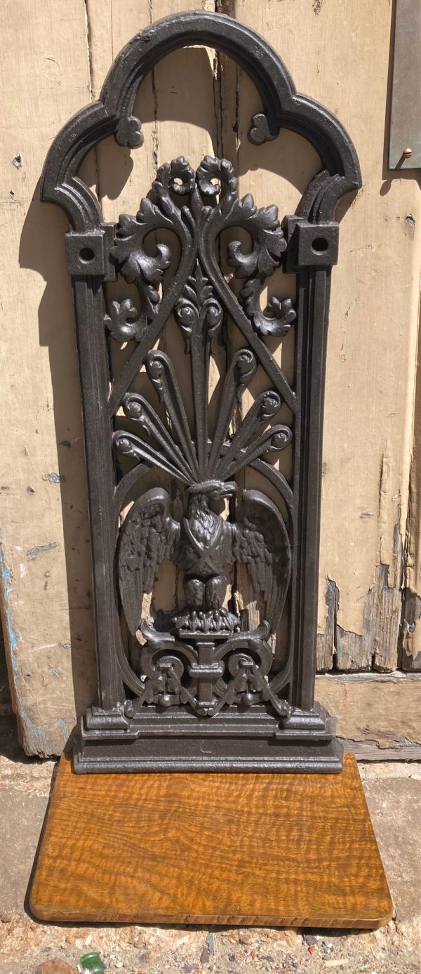 Shelf with ornate cast iron back and polished wooden base, 66cm high x 26cm wide (D104) $125
