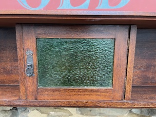 Detail of double shelf original polished timber mantel with green glass door, top shelf W 1410 x D 270mm, height 1360mm, outer leg 1325mm opening 915 x 915mm (M300) $445