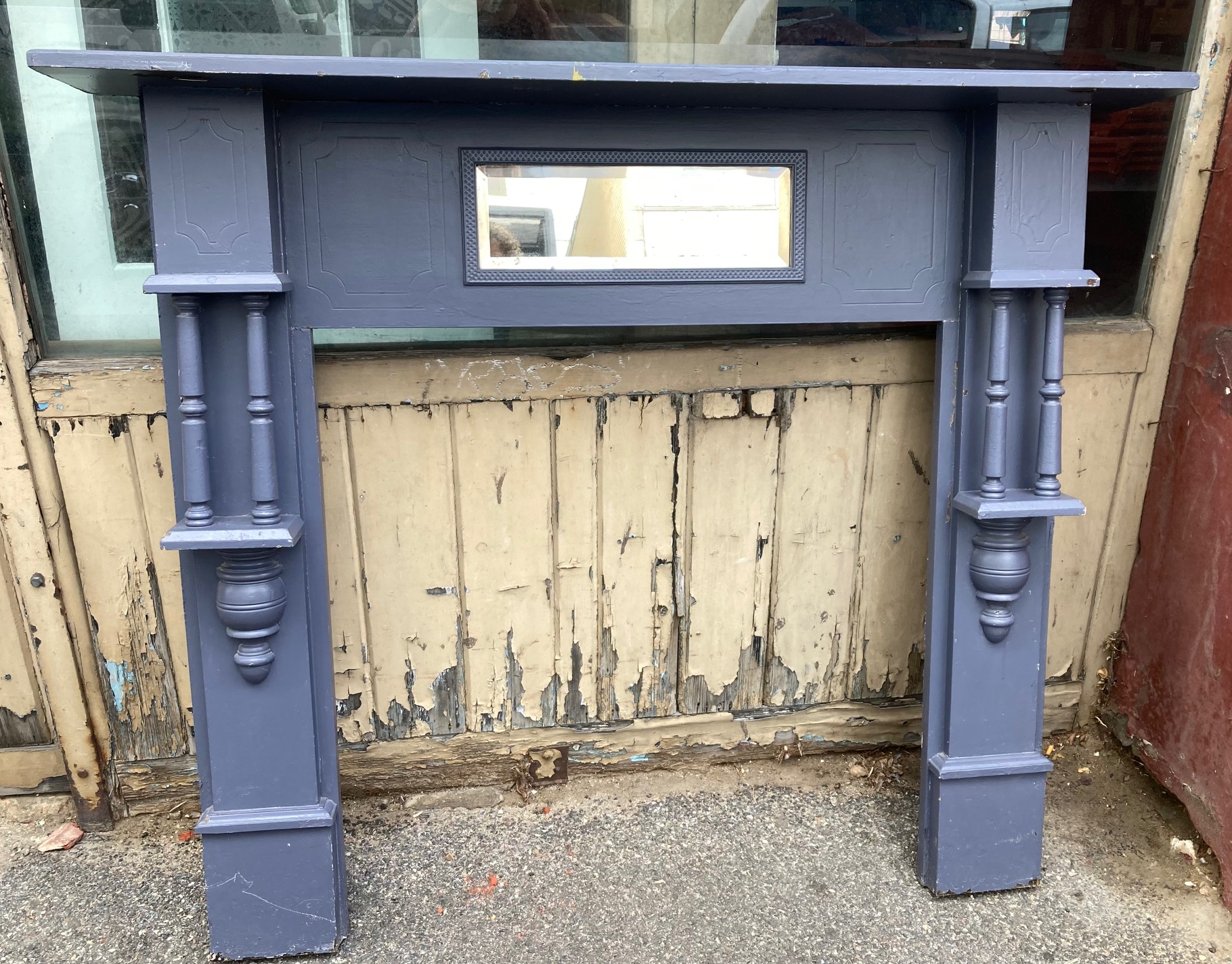 SOLD Timber mantel, painted grey/purple with bevelled mirror, split turning and column detail, top shelf 1420 W x 230 D, height 1270, opening 915 W x 900 H (M71) $220