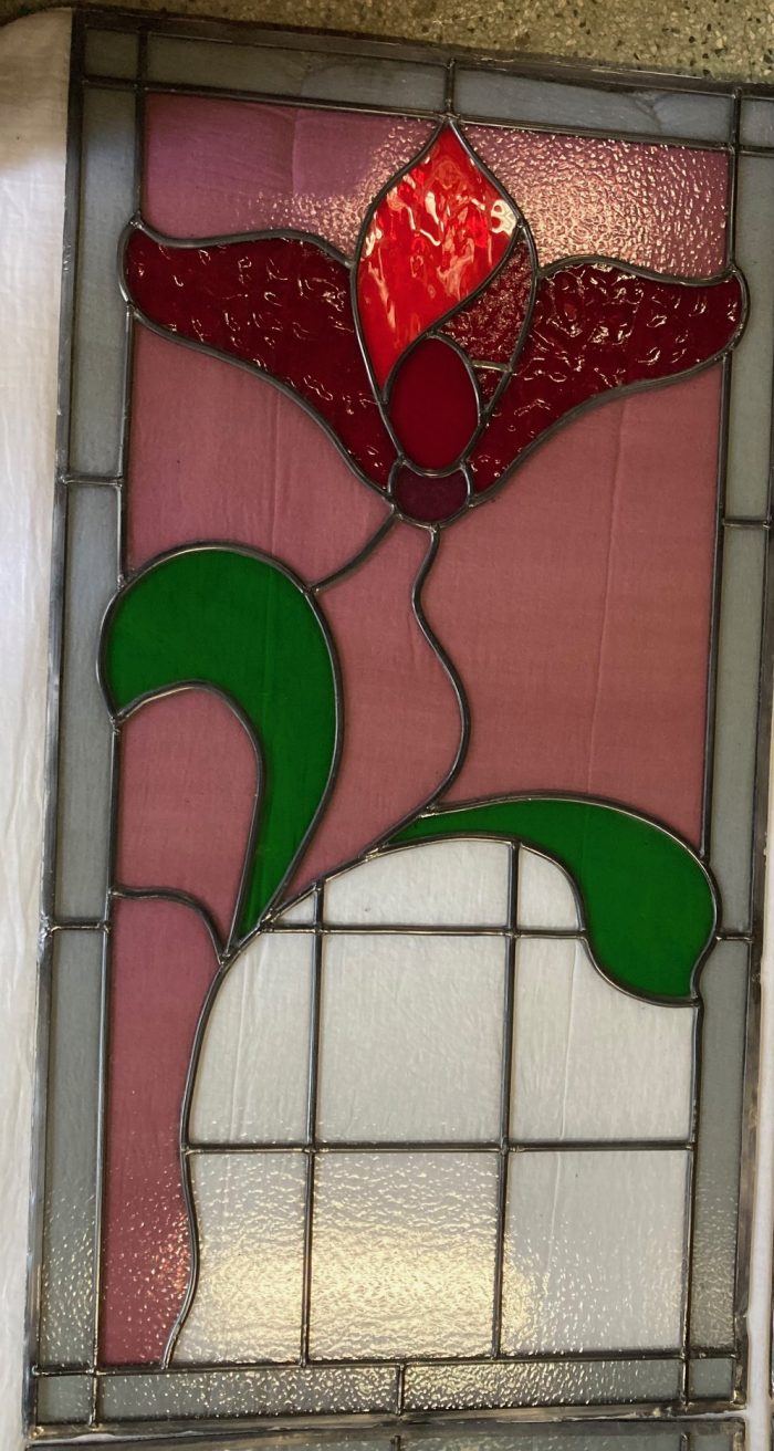 Stunning original restored Art Nouveau lead light panels in pink, red and green, each panel is 440 W x 830 H. Sold in pairs of top and base. Top panel pair #1 (LL56) $545 for each pair