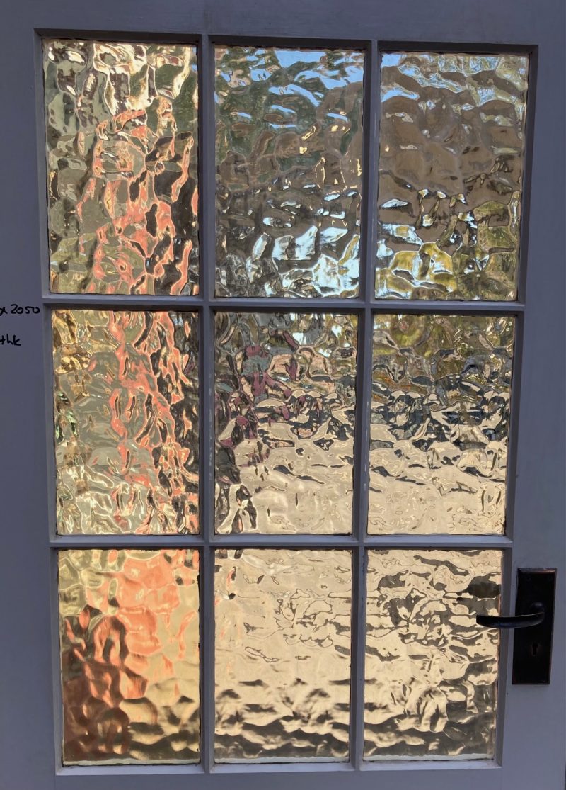 Glass detail of solid timber white painted door with 9 panel amber leadlight and original bronze hardware, 2050 H x 860 W x 45 D (D255) $345
