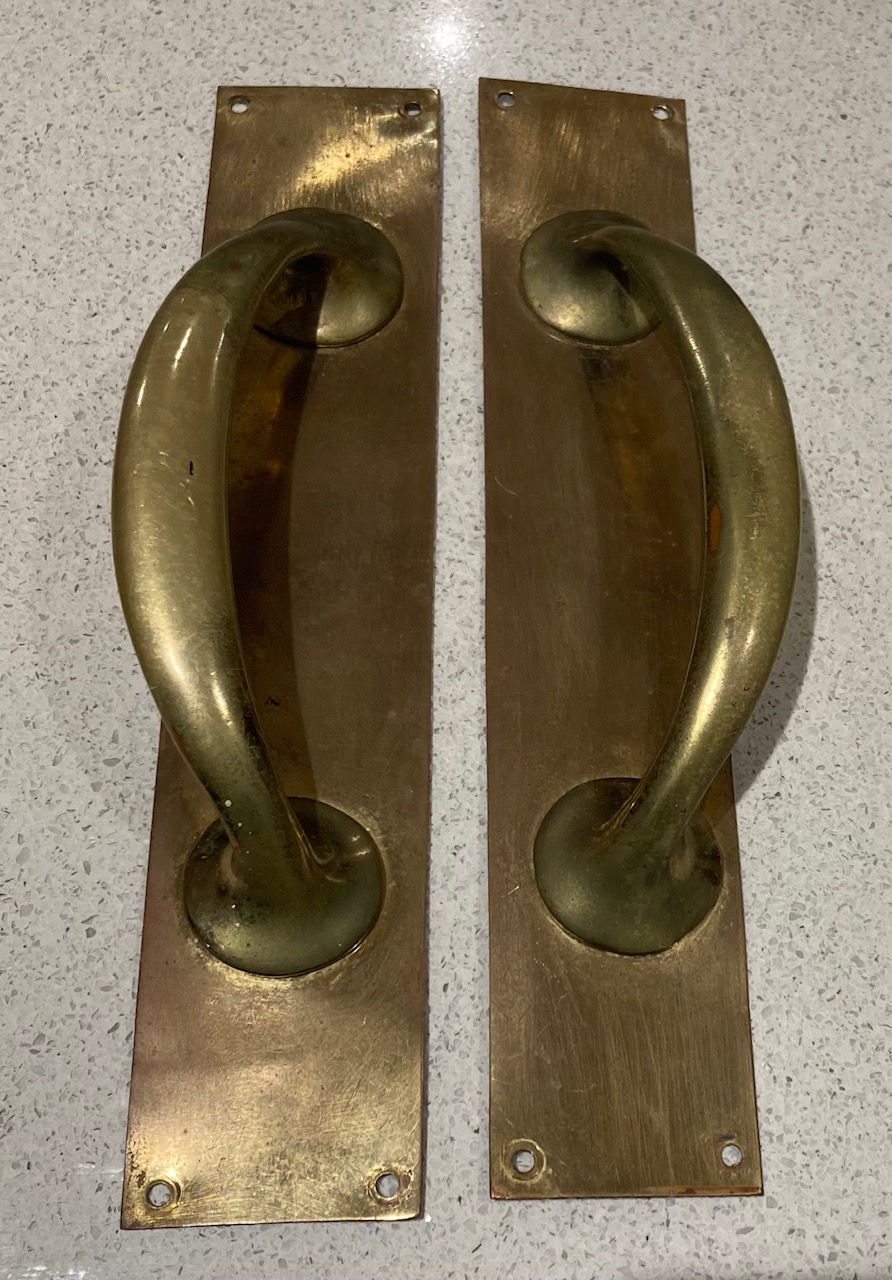 SOLD Original stylish brass door handles, 255mm H x 50mm W x 40mm profile (H451) $90 pair