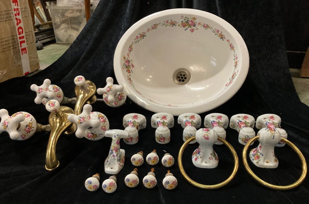 SOLD Porcelain bathroom set, Armitage Shanks brand includes basin, 2 x double brass tap sets, 1 x hook, 2 x circular brass hand towel rails, 8 handles and 6 ends for towel rails * damage to corner of one towel rail holder, (S173RR) $345 set