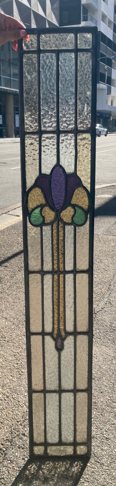 Original restored Art Nouveau leadlight in purple, green and gold, 1120H x 180W (Fozi LL89 ) $365