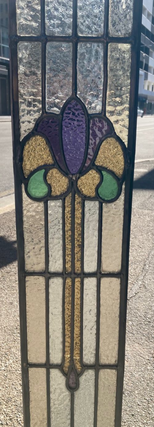 Detail of original restored Art Nouveau leadlight in purple, green and gold, 1120H x 180W (Fozi LL89 ) $365