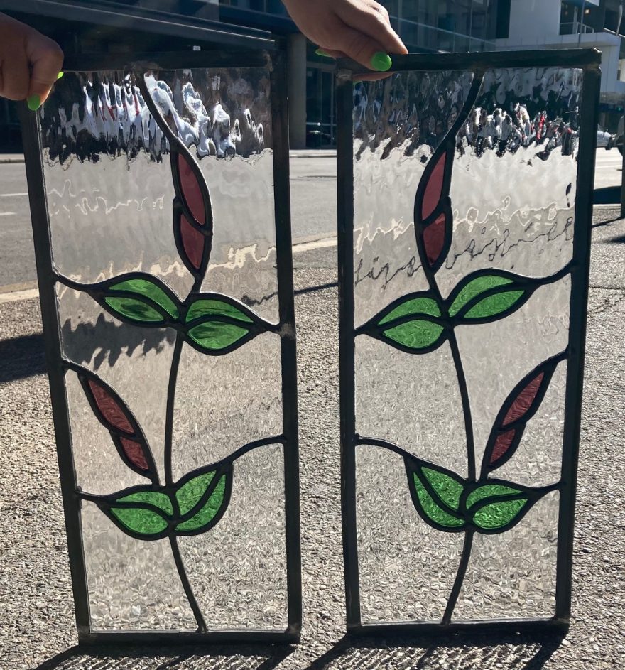 Original restored leadlight in red and green, each panel is 485 H x 200 W (LL93) $155 for the set