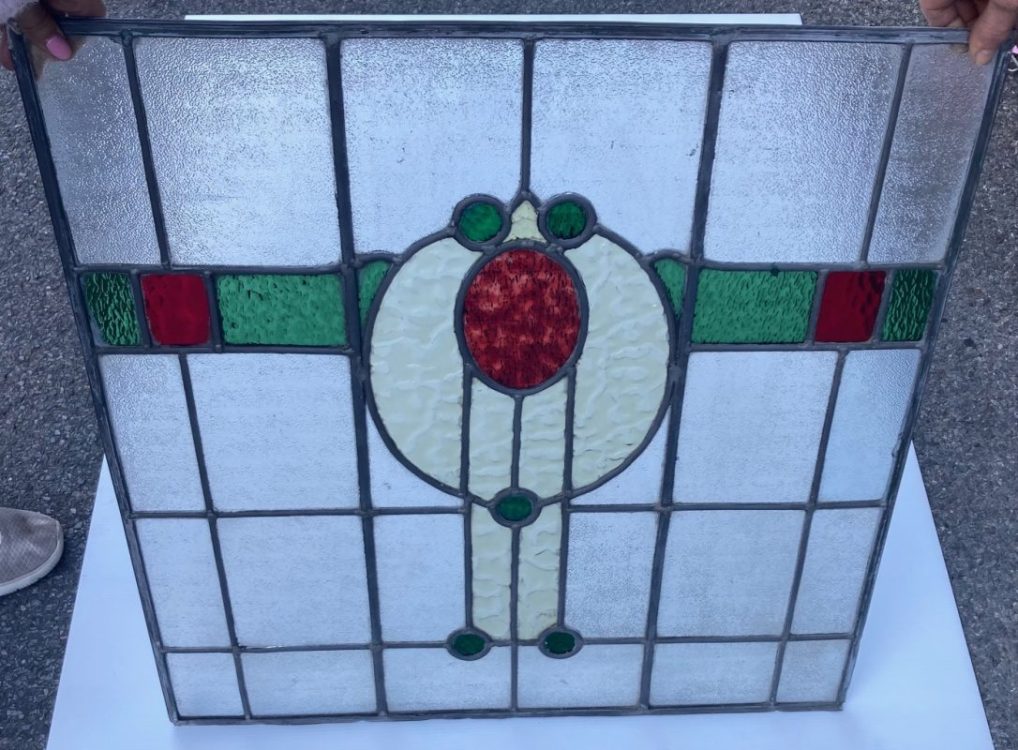 Original leadlight c1910 red, gold, green and textured clear glass leadlight door panel, 660 H x 640 W, 2 matching side panels (LL40) also available this door panel $350