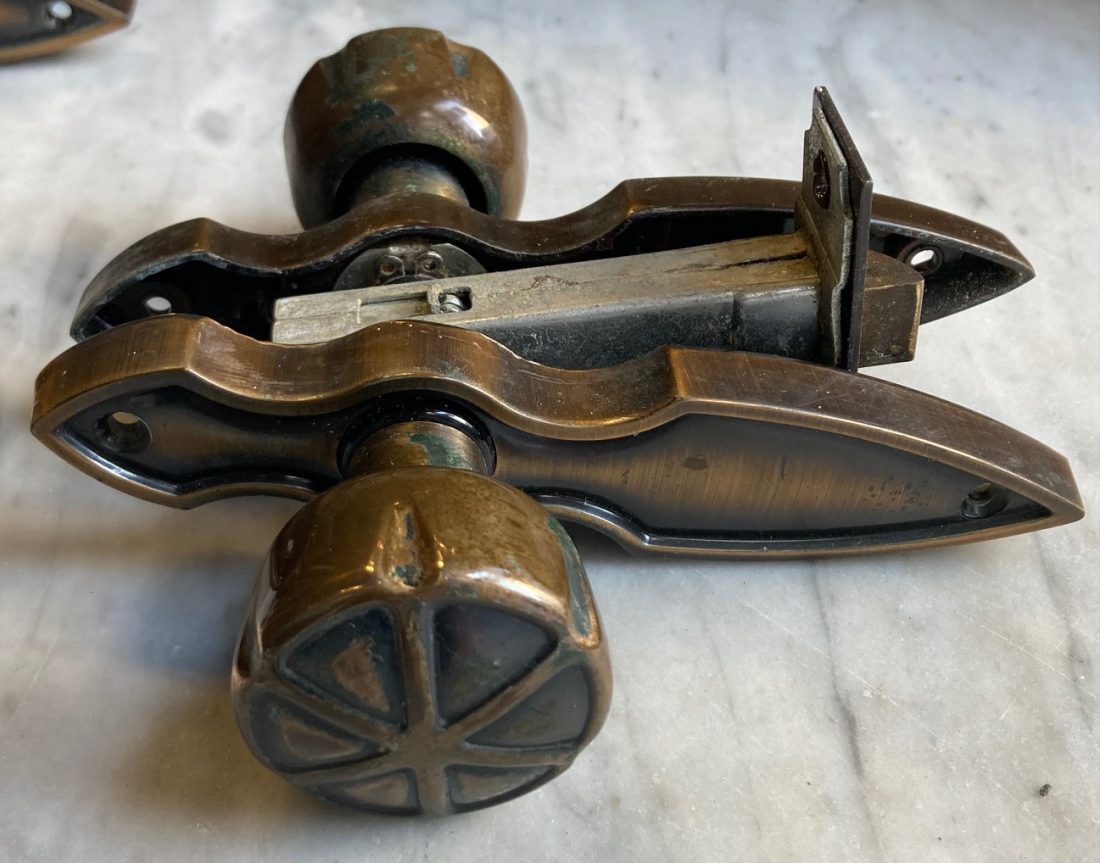 Detail of 1970s Florentine bronze door handle sets, including keepers, locks and screws, 14.5cm H x 5.5cm profile (H468) $35 per set