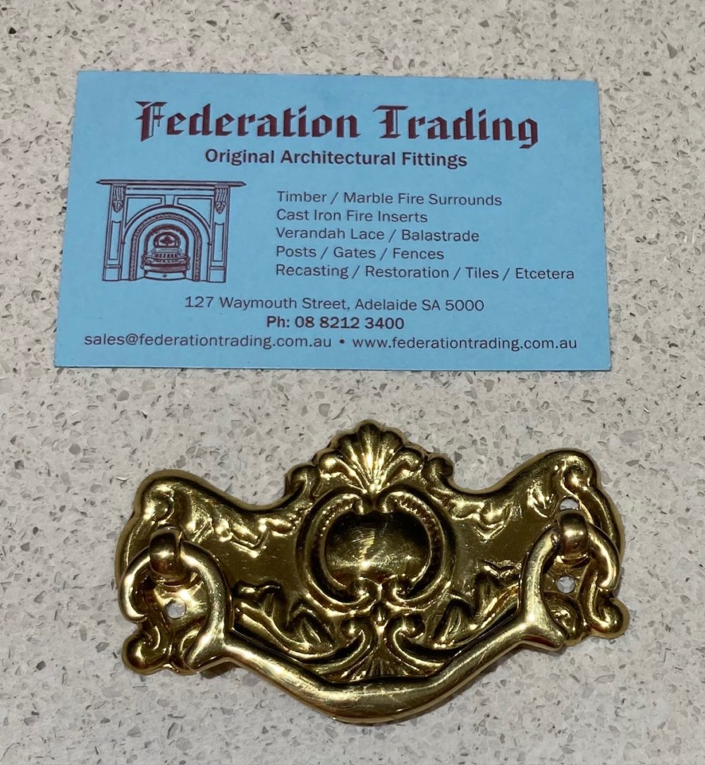 Stamped polished brass, Superior brand cabinet handles, unused, 80 W x 48 H, 3 available (H489) $7 each