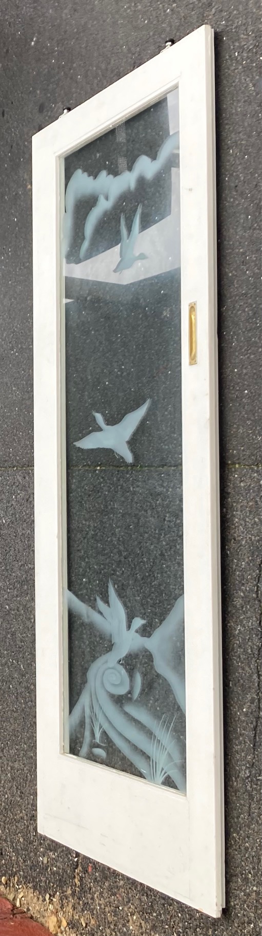 Door detail of pair of duck sliding doors, timber frames with etched glass, 2017 H x 1695 W x 40 D (D273) $330