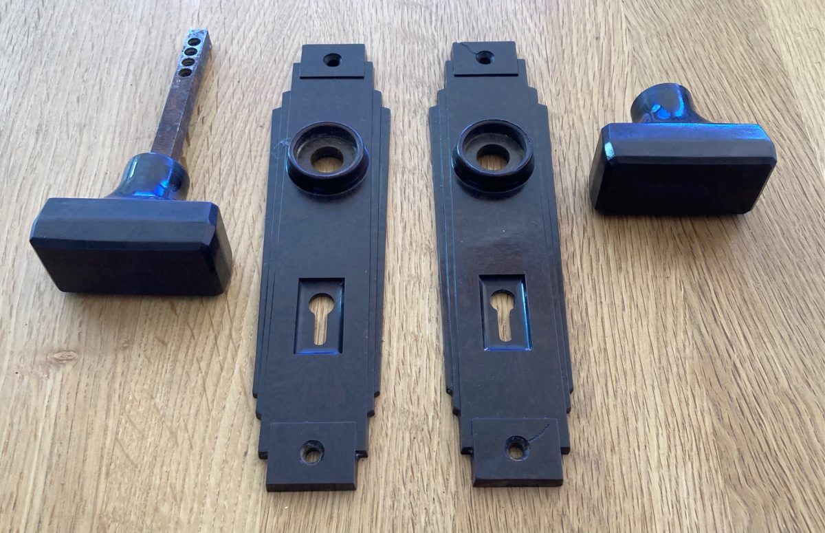 ON HOLD R/68 Original Art Deco bakelite set, 2x plates and 2x handles, plate height 18cm (H138) $65