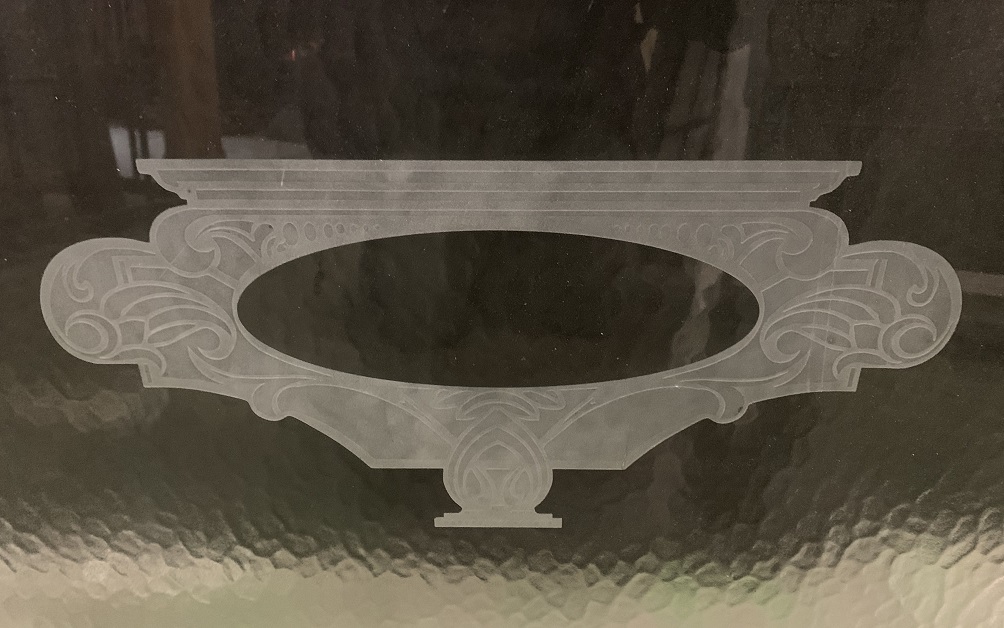 Detail of Timber framed fixed glass panel, clear glass with slight ripple texture, decorative etched border and detail, looks ready to have etched words added, H 132 x W 89 x D 3.5cm, $285