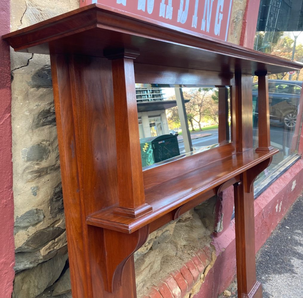 Polished double shelf timber mantel with bevelled edge mirror, pillars and carved trim, top shelf 1660 W x 290 D, height 1540, opening 915 W x 895 H (M121) $845