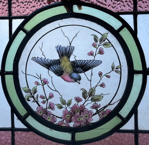Detail of hand painted swallow and blossom leadlight panel in pink and green with etched glass features, W 695 x H 340mm (LL286FOZI) $655