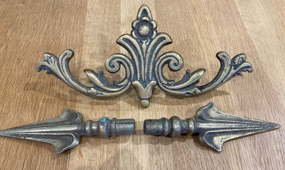Flower design brass curtain hardware, centre ornament 255mm W x 120mm H with two spears, 150mm L each (H248) $55 set of 3