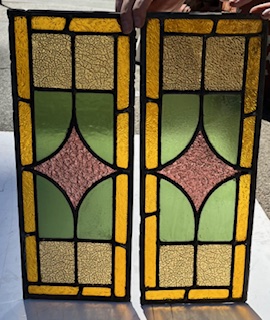 Original unusual textured leadlight pair restored and originally from heritage listed Murphy House, Glenelg, pink, green and amber colourways, 455 x 180mm each panel (LL298) $145 each