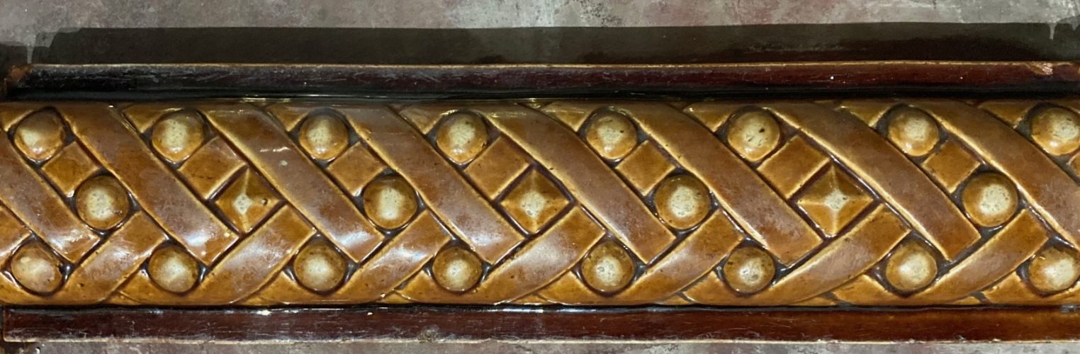More detail of original English pottery fire curb, light brown glaze, plaited design, size adjustable, interior dimensions 1225 x 375, exterior dimensions 1425 x 490 (F196) $485