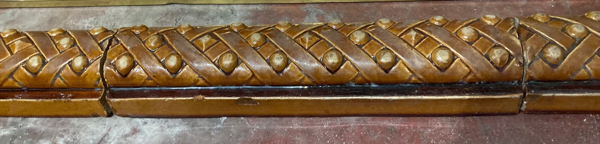 Detail of plaited design on original English pottery fire curb, light brown glaze, size adjustable, interior dimensions 1225 x 375, exterior dimensions 1425 x 490 (F196) $485