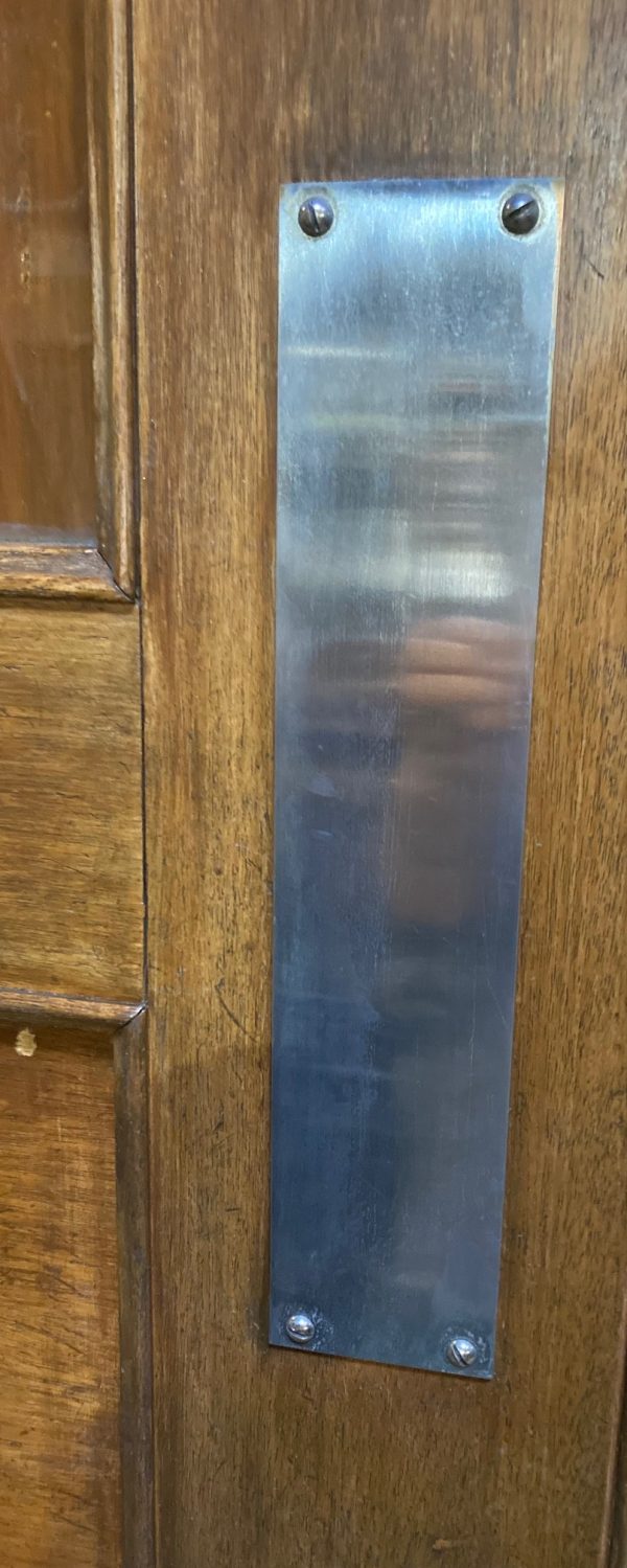 Nickel plate detail of extra tall ex commercial/institutional maple timber door pairs, nickel push plates on rear and nickel handles on front, with closers. Previously set up as swing doors, can be rebated for French doors, 2564 H x 1510 W x 45 D (D218 and D219) $645 per pair