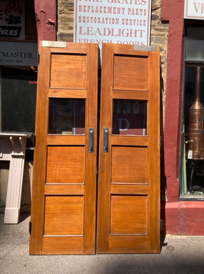 Extra tall ex commercial/institutional maple timber door pair, nickel push plates on rear and nickel handles on front, with closers. Previously set up as swing doors, can be rebated for French doors, 2564 H x 1510 W x 45 D (D218) $645 pair