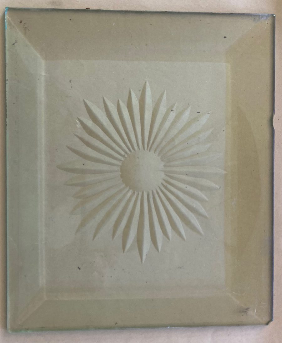 Bevelled glass panes with cut flower design, 28 available, ex old train carriage, each pane 200 x 170 (S112RR) $25 each