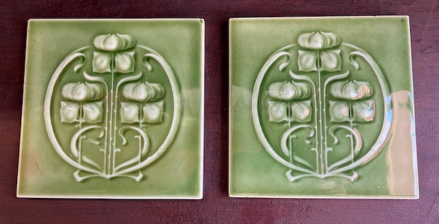 SINGLE Art Nouveau design registered in 1906 by T & R Boote England, embossed tiles with trio of stylised flowers in a border of circular foliage, soft green glaze, 2 6 x 6-inch tiles available (SB8) $60 each