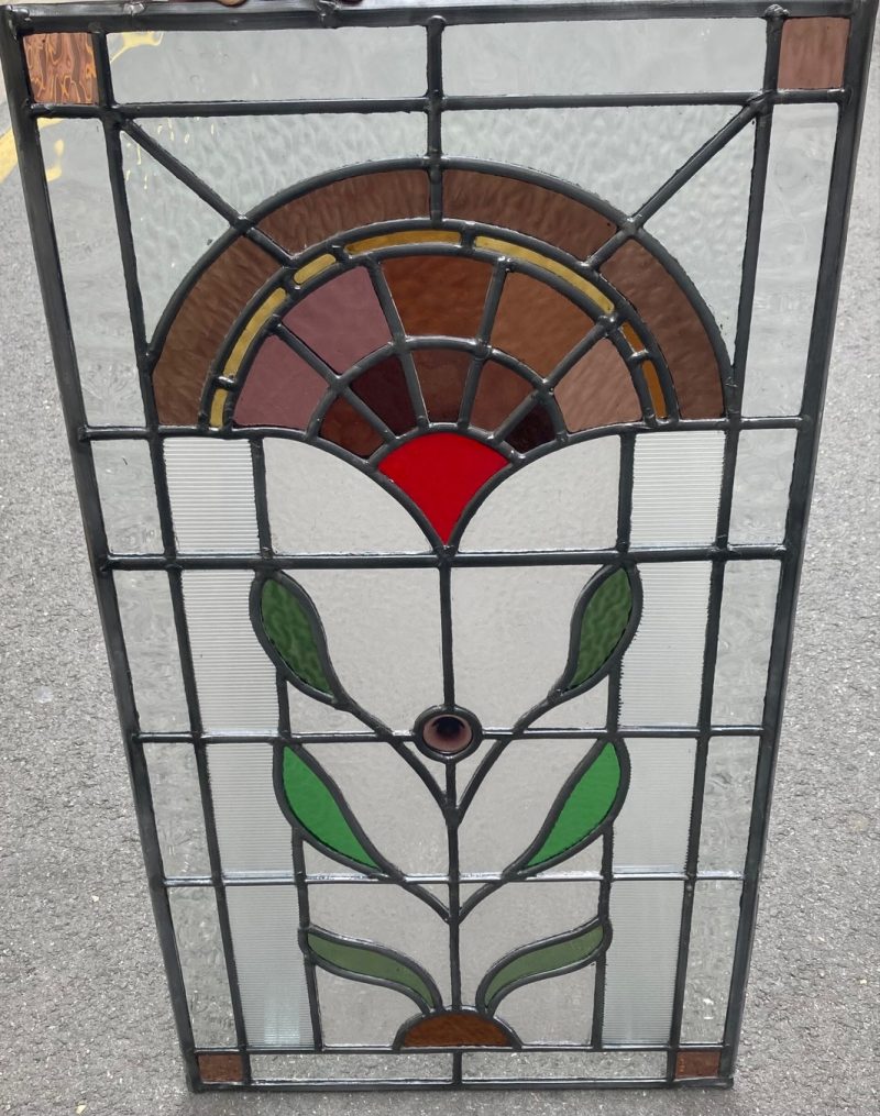 Original restored leadlight with new caning, warm red and brown stylised flower, 765 H x 405 W (LL201FOZI) $465